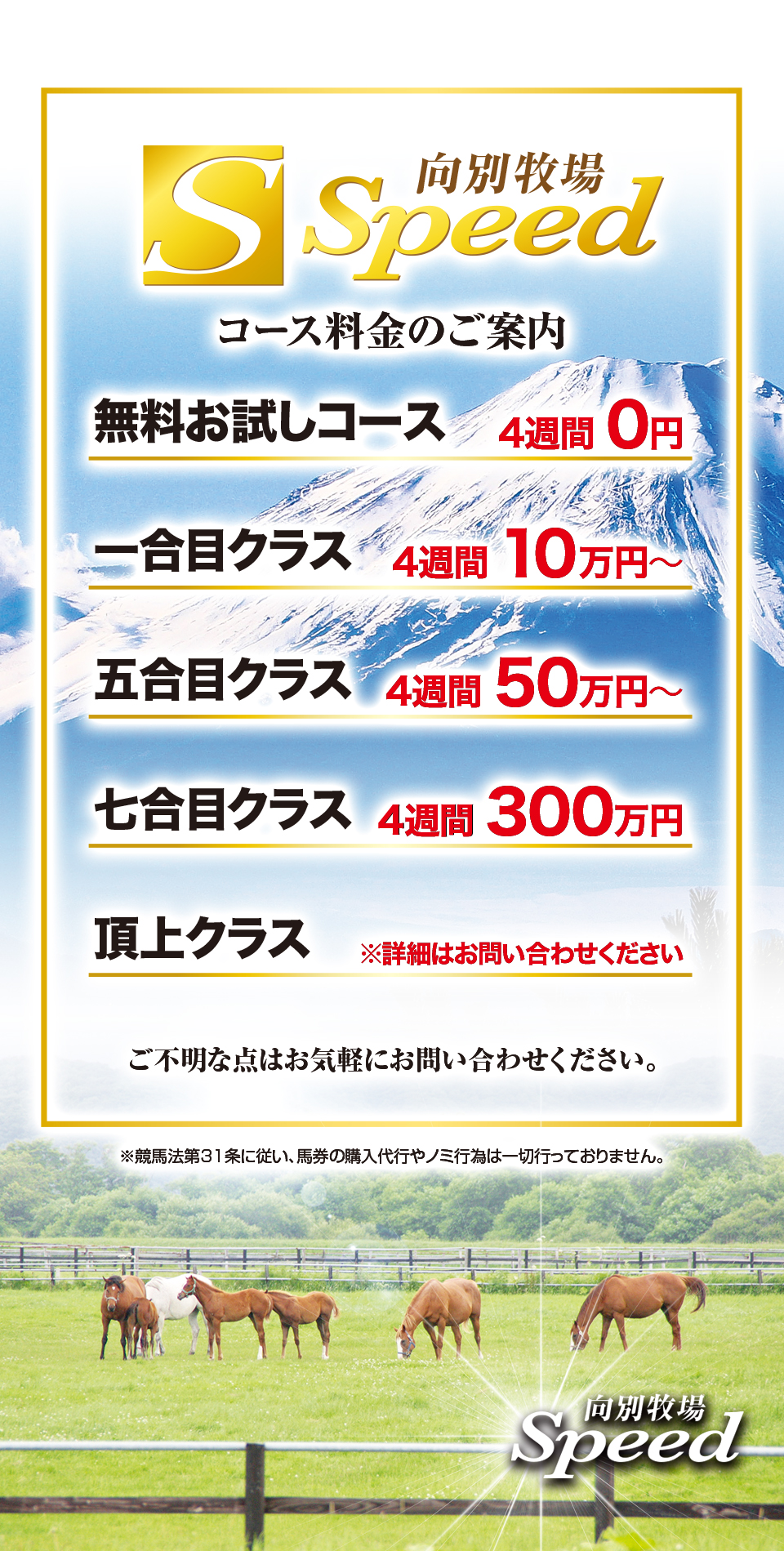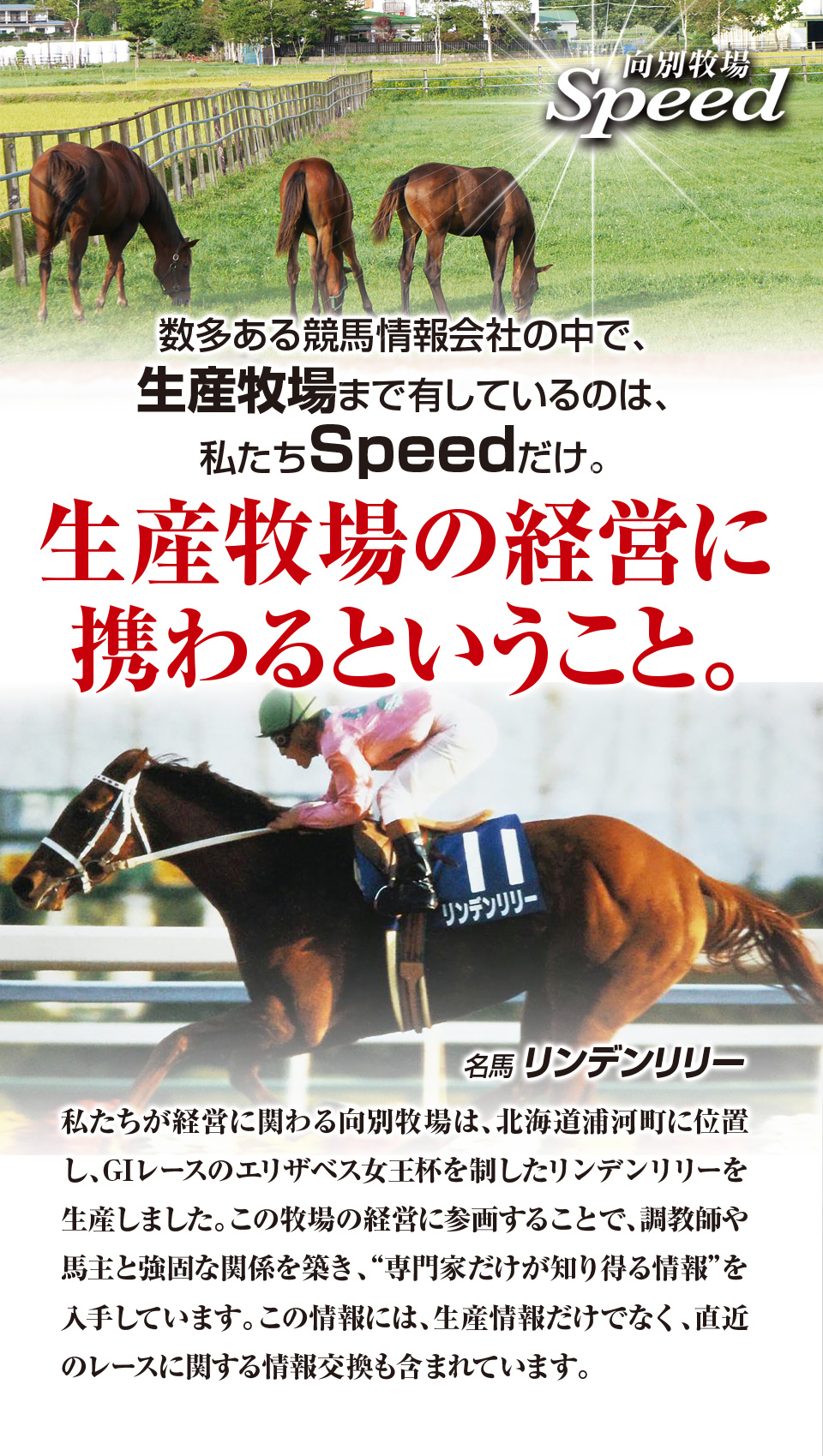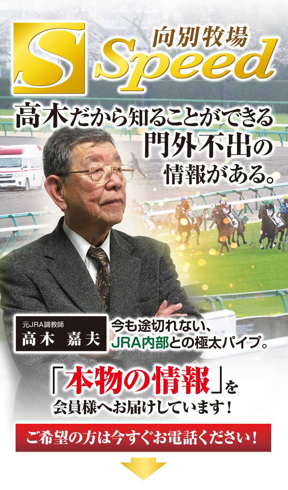 Speedの情報は、牧場関係者だから知り得る一般公開されない休養明けの本当の仕上がり具合やレース直前の勝負度合いまで、リアルな本物の情報をお届けしています。